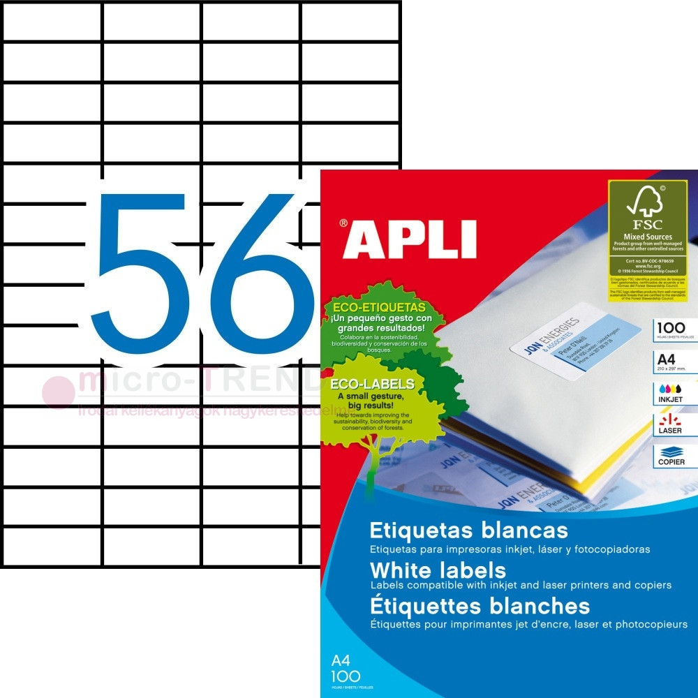 APLI No. 01284 fehér színű 52,5 x 21,2 mm méretű, univerzálisan nyomtatható, öntapadós etikett címke, permanens ragasztóval A4-es íven - kiszerelés: 5600 címke / 100 ív (LCA1284)