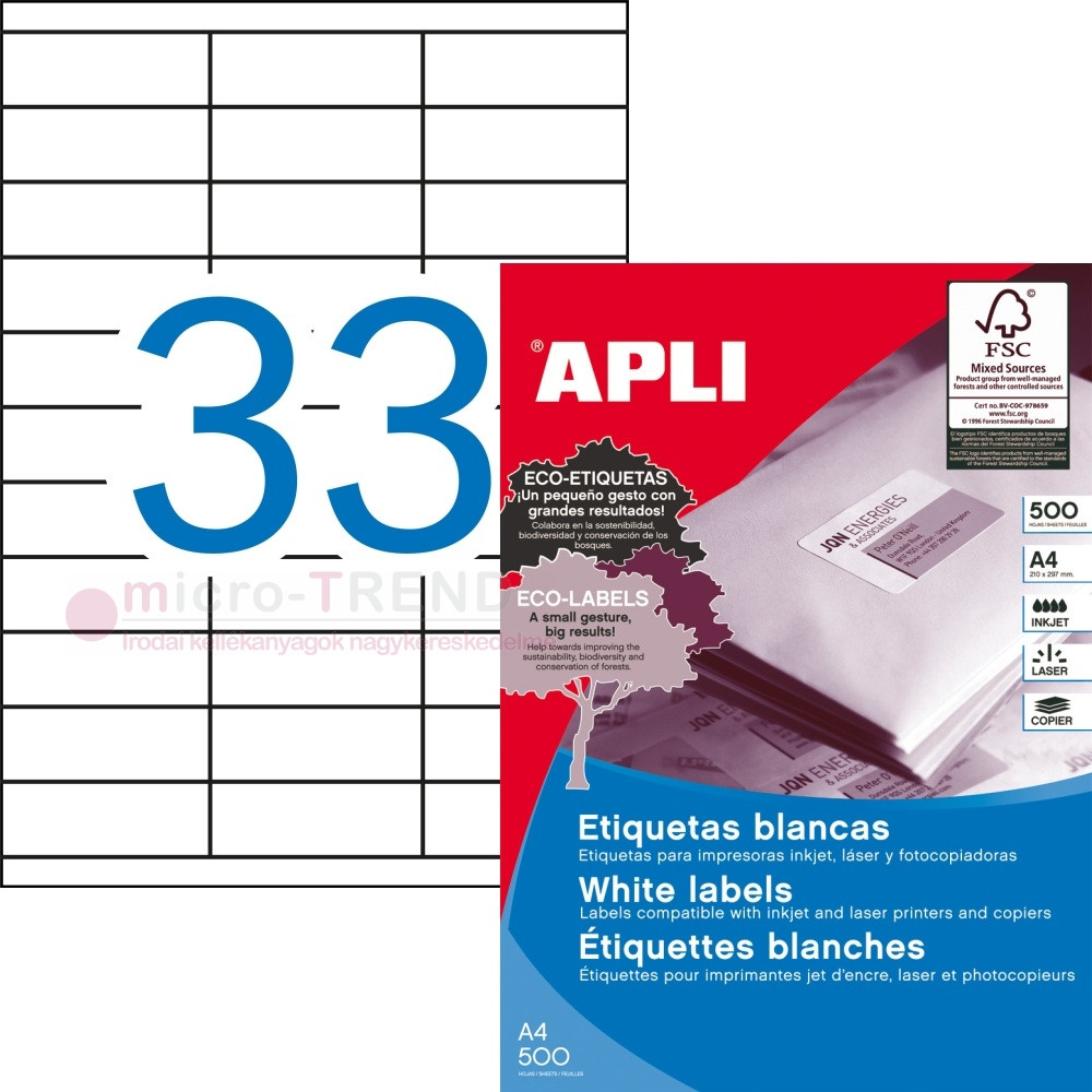 APLI No. 10559 fehér színű 70 x 25,4 mm méretű, univerzálisan nyomtatható, öntapadós etikett címke, permanens ragasztóval A4-es íven - kiszerelés: 16500 címke / 500 ív (LCA10559)