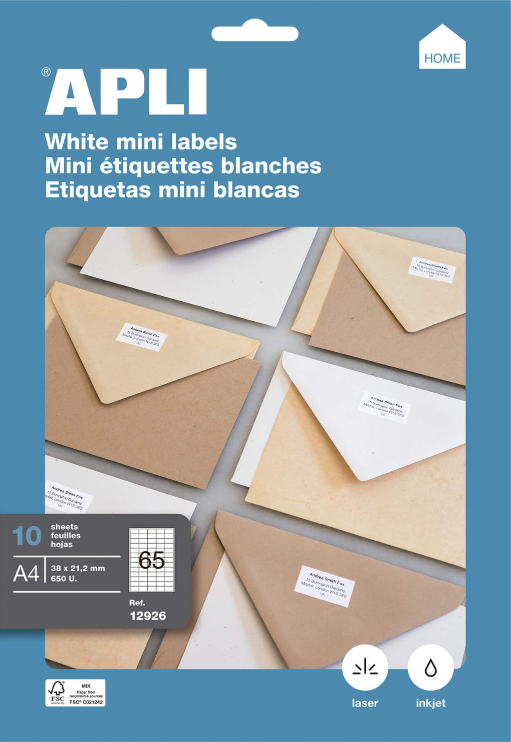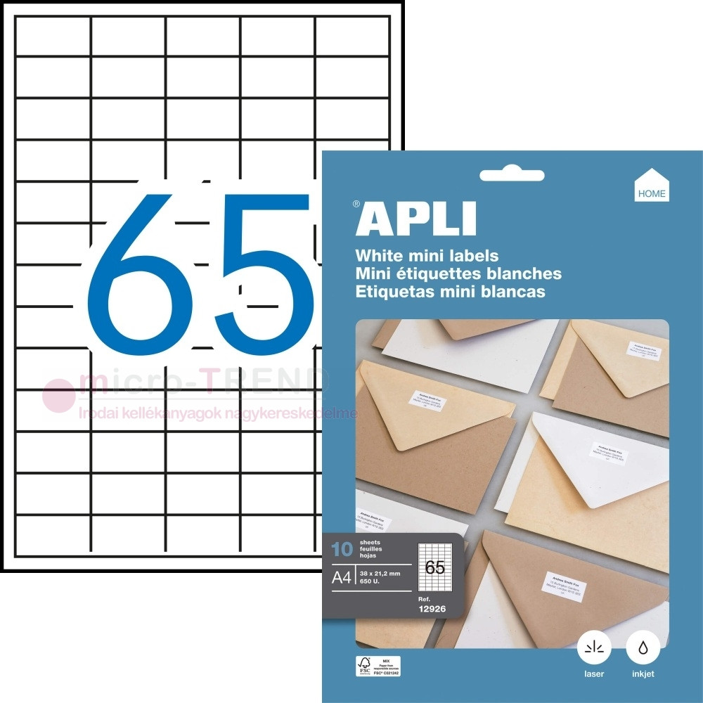 APLI No. 12926 fehér színű 38 x 21,2 mm méretű, univerzálisan nyomtatható, öntapadós etikett címke, permanens ragasztóval A4-es íven - kiszerelés: 650 címke / 10 ív (LCA12926)