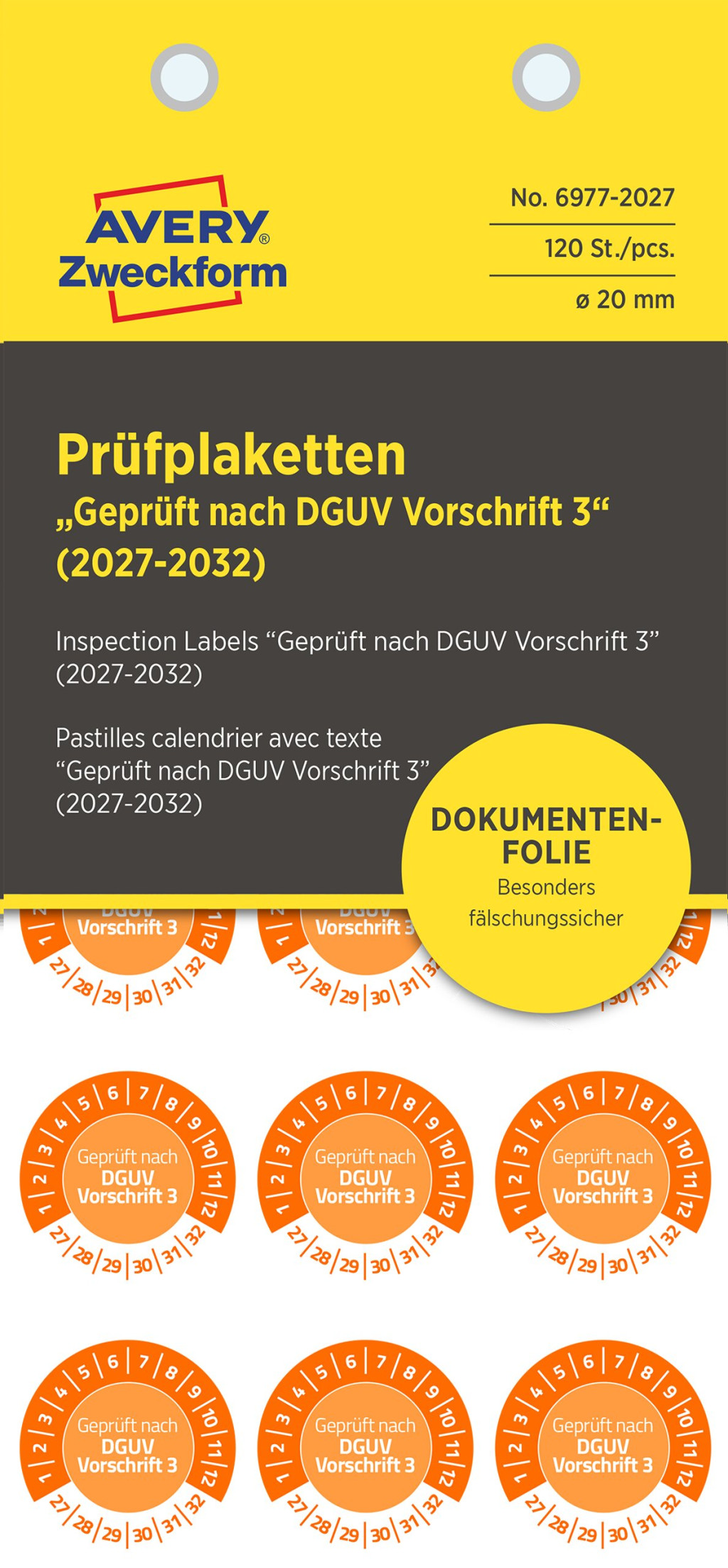 Avery Zweckform No. 6977-2027 narancssárga színű, 20 mm átmérőjű, öntapadós biztonsági hitelesítő címke, 2027-2032-es évszámmal, Geprüft nach DGUV Vorschrift 3 felirattal - kiszerelés: 120 címke / csomag