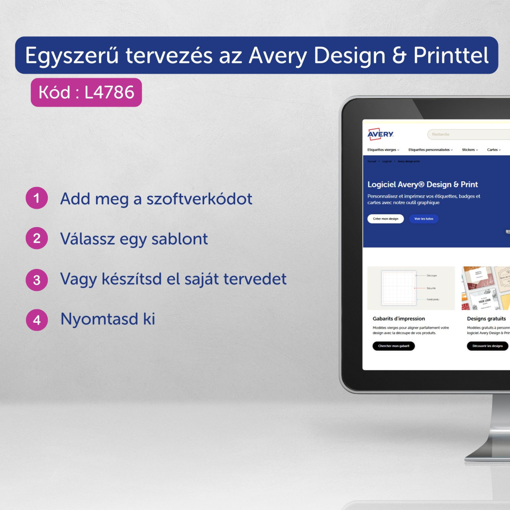 Az Avery Zweckform ingyenes szoftverekkel és sablonokkal segíti az etikett címkék gyors és esztétikus megtervezését, kinyomtatását. A legfrissebb Avery Zweckform szoftverek és frissítések öntapadó etikett címkék tervezéséhez és kinyomtatásához az alábbi linkre kattintva érhetők el: angol nyelvű oldal, német nyelvű oldal, magyar nyelvű oldal. Ingyenesen letölthető Microsoft Word sablon Avery Zweckform L4786-20 címke szerkesztéséhez (letöltés). Szoftverkód: Avery L4786.