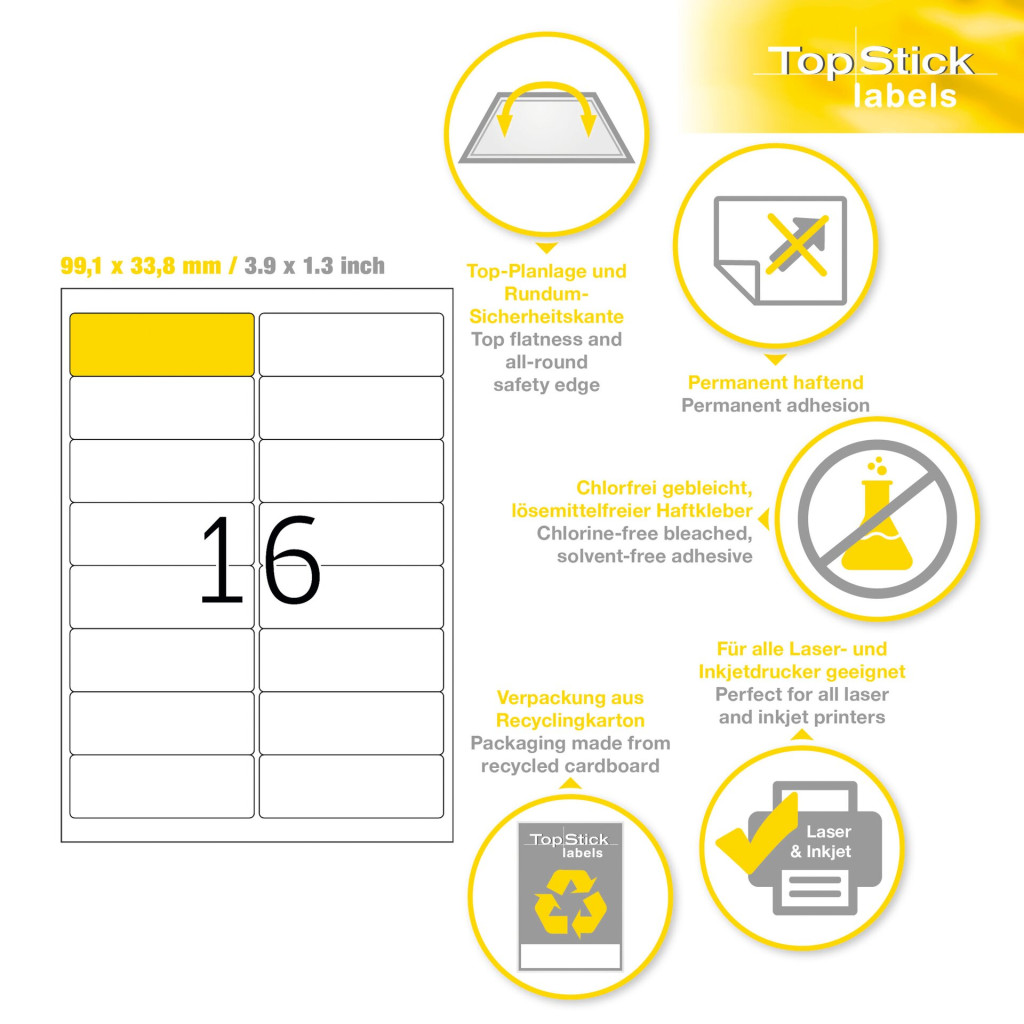 TopStick No. 8756 fehér színű 99,1 x 33,8 mm méretű, univerzálisan nyomtatható, öntapadós etikett címke, permanens ragasztóval A4-es íven - kiszerelés: 1600 címke / 100 ív