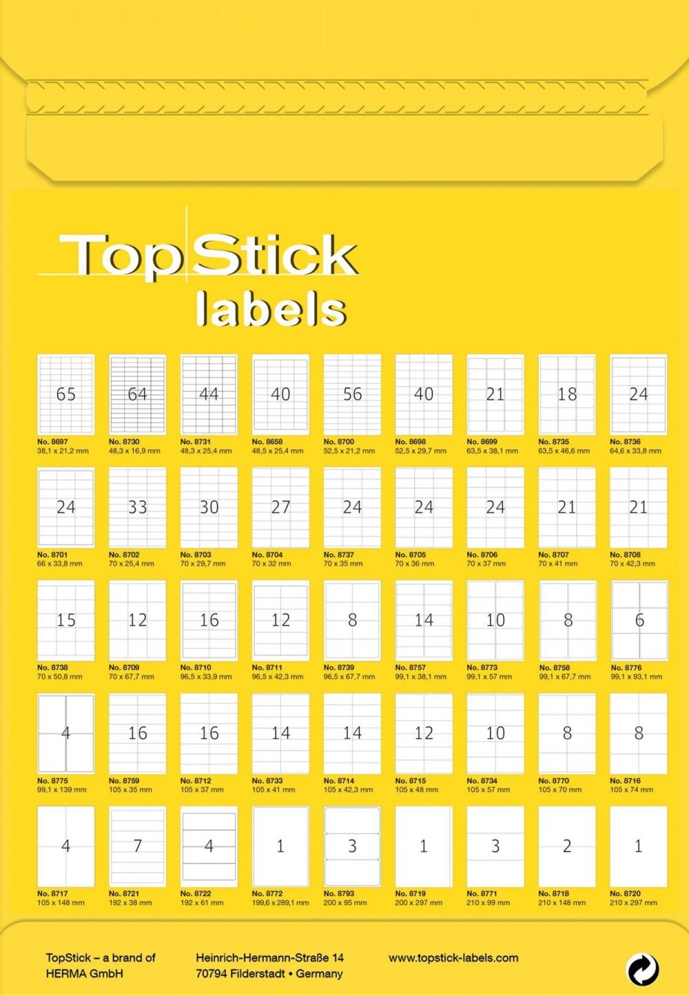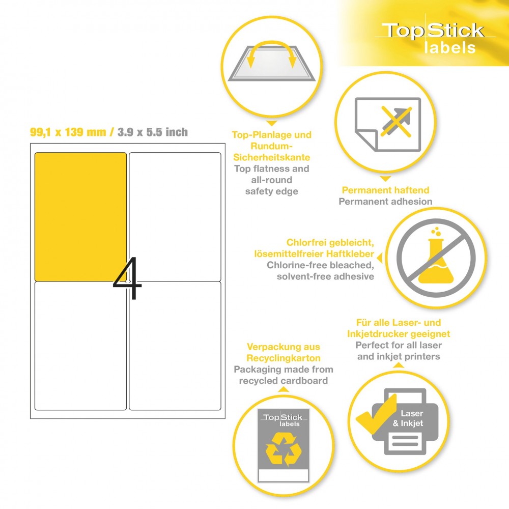 TopStick No. 8775 fehér színű 99,1 x 139 mm méretű, univerzálisan nyomtatható, öntapadós etikett címke, permanens ragasztóval A4-es íven - kiszerelés: 400 címke / 100 ív
